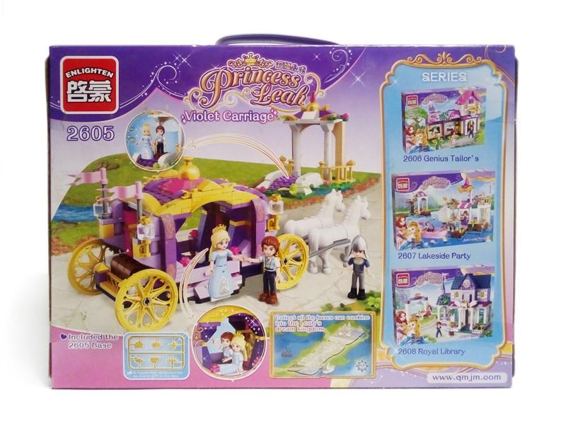 Конструктор для девочки состоит из 374 мелких деталей, из которіх предстоит собрать: большую фиолетовую упряжку с двумя лошадками и тремя героями волшебного мира принцесс: У кареты открываются окошки, спереди, есть место для кучера.