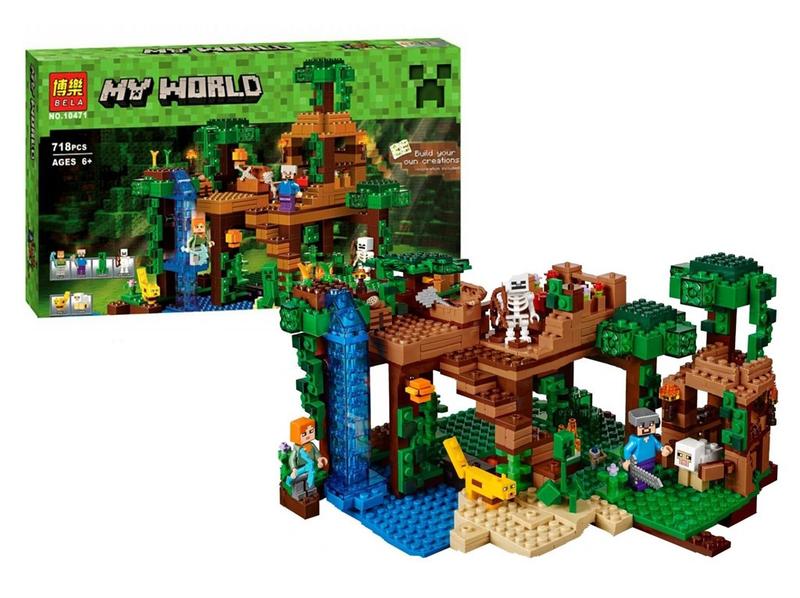 Интересный конструктор по миру Майнкрафта, на этот раз состоит из тёмно- зелёных деталей -- листвы, и разных оттенков коричневого -- досок, брёвен и стволов деревьев. Домик может быть построен в трёх разных вариантах, каждый раз со всё более интересными ухищрениями и ловушками. Такими как проваливающийся пол, водяной лифт, и заминированный песок. В набор входит: - Стив; - Алекс; - Скелетон-лучник; - Оцелот; - Крипер; - Стриженая овечка.