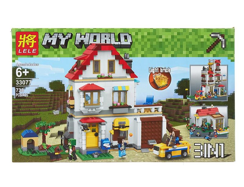 Альтернативный конструктор Майнкрафт с возможностью постройки элитного частного дома в трёх вариантах: одно, двух и трёхэтажном. Домик будет иметь белый фасад и красную крышу в любой из сборок, также предоставляется машинка, гараж для её хранения, собачья будка и другие мелочи. Конструктор содержит 738 деталей, имеет подсветки, 3 фигурки персонажей и собачку.