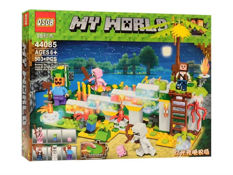 Похоже, что мы видим полу-автоматизированную морковную ферму из мира майнкрафт. И что ещё интересно - в конструкторе полным-полно пестрящих, светящихся блоков. Конструктор состоит более чем из 503 деталей, кроме грядок и моркови включает пальму, лестнички, корни, основной плацдарм и 6 воодушевлённых фигурок: 1. Стив с тыквой на голове. 2. Друг Стива. 3. Свинозомби. 4. Скелетон-лучник. 5. Поросёнок. 6. И какой-то огурчик.