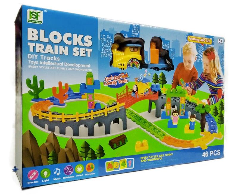 Конструктор "blocks train set" 3388-6 железная дорога. Малышу 3+ предстоит собрать железную дорогу с мостом по которому будет ездить паровозик, все это нужно продумать из 46 деталей.