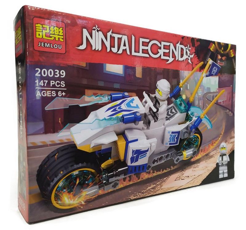 Детский конструктор состоит из 147 мелких деталей. ребенку предстоит собрать белого ниндзю Зейна на мотоцикле.
