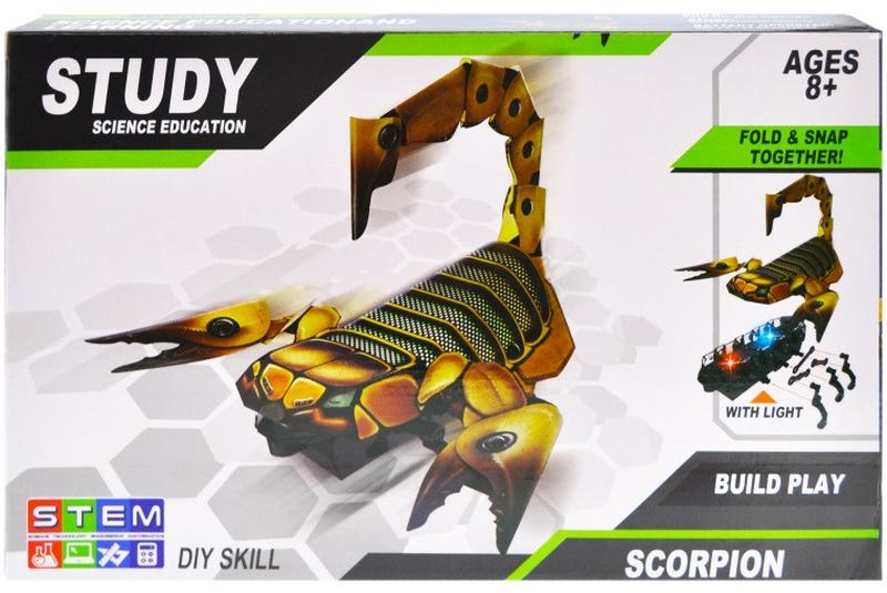 Электронный конструктор включает множество элементов, из которых даже ребенок сможет составить оригинальную фигурку желтого скорпиона. Конструктор -- это превосходная возможность для юного исследователя проявить конструкторские навыки и своими руками собрать уникальную модель робота скорпиона. Конструирование развивает логическое и образное мышление, наблюдательность и самостоятельность, а также моторику рук и ловкость пальцев. Сложив и вставив батарейки робот скорпион, светиться разноцветными огоньками и начинает реалистично двигаться перебирать лапками. Простой в сборке корпус с подсветкой. Работает от 2 батареек типа АА (в комплект не входят). Размер коробки 29 * 5 * 19 см.