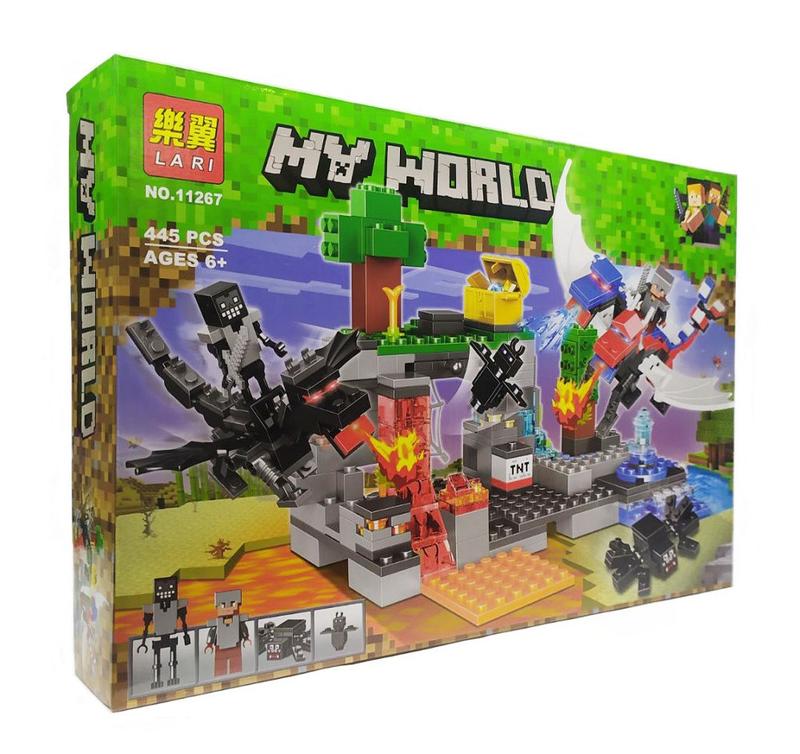 Детский конструктор состоит из 445 мелких пластиковых деталей из которых предстоит собрать битву драконов.. В наборе четыре персонажа из компьютерной игры minecraft.