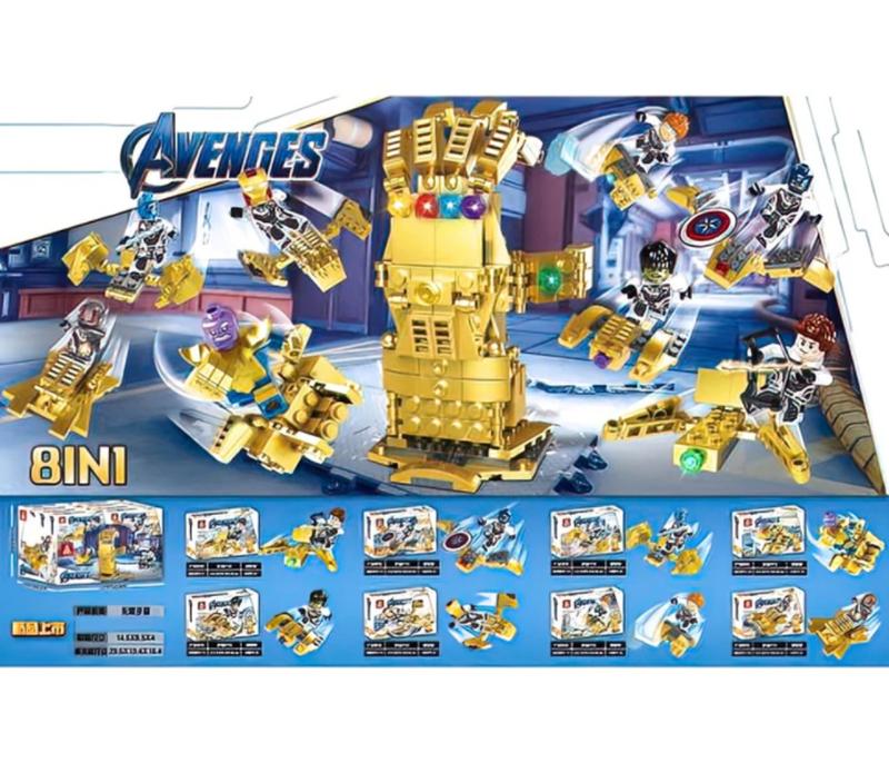 Набор конструкторов супергероев Мстители состоит из 8 отдельных коборочек с супергероями на транспорте, который складывается в перчатку Таноса Бесконечности. Будет незабываемым подарком ребенку.