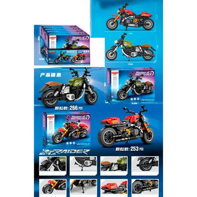 Конструктор L33022 предназначен для сборки моделей мотоциклов с реалистичными элементами конструкции. В наборе представлено два варианта – мотоцикл длиной 17,2 см (253 детали) и модель длиной 18.6 см (266 деталей). Все элементы изготовлены из пластмассы и имеют точные крепления, обеспечивающие надежное соединение при сборке. Готовые модели оснащены подвижными колесами, детализированной рамой и декоративными вставками, которые имитируют настоящую технику. Конструктор способствует развитию мелкой моторики, пространственного мышления, усидчивости и интереса к техническому творчеству.