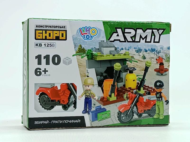 Конструктор Limo Toy Army "Блокпост" (110 деталей) KB125B Погрузитесь в мир военных приключений с конструктором "Блокпост" от Limo Toy! Этот детский конструктор станет отличным выбором для маленьких любителей армии и военной техники, предоставляя возможность создавать свои собственные захватывающие истории и сценарии. Основные характеристики: - Модель: Блокпост KB125B - Количество деталей: 110 - Возрастная группа: Рекомендуется для детей от 6 лет - Материалы: Пластик Конструктор состоит из 110 пластиковых деталей, включая: - Элементы постройки блокпоста - Фигурки солдат (включая различные позы и экипировку) - Дополнительные аксессуары (оружие, мотоцикл) Конструктор "Блокпост" от Limo Toy станет не только замечательным подарком на день рождения или праздник для вашего ребенка, но также источником вдохновения для создания множества увлекательных историй! Подарите ребенку шанс стать настоящим строителем своей армейской базы - это будет не только весело, но также полезно!