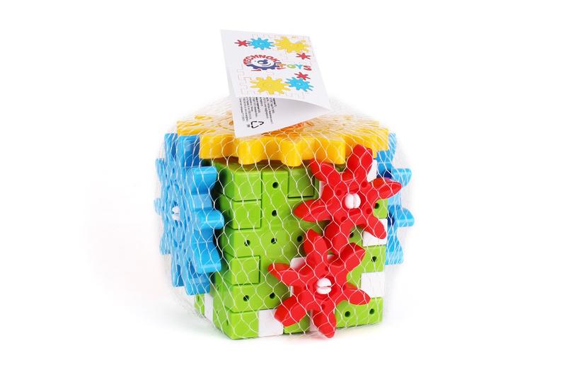 В наборе шестерни разного размера, пластины-пазлы и фишки мозаики. С пластин белого и салатового цветов собирается куб или плита, на которые фиксируются шестерни с помощью специальных креплений. Если собрать шестерни в правильном порядке, вся конструкция, будто «оживает» при вращении. Всего в наборе 53 элемента, собранных в форме куба. Габаритные размеры: 12 х 12 х 11.5 см