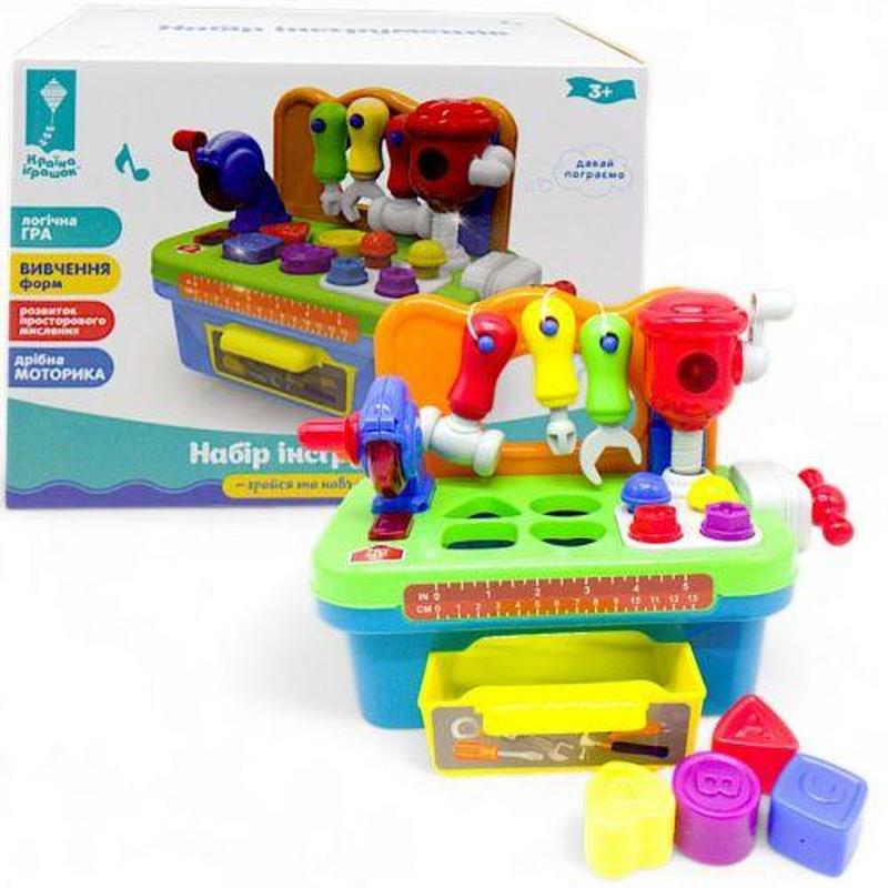 Уценка. Столик с инструментами (тактильное развитие) (Повреждена упаковка) Увлекательная развивающая игрушка в виде столика с инструментами. На игровой панели есть различные элементы: игра-сортер, молоточек, отвертка, гаечный ключ, винтики, кнопки, вентиль, ручки (при вращении ручки активируется звук и светятся детали корпуса). Также, столик оснащен небольшим ящиком в котором хранятся детали сортера. Размер конструкции – 20х15,5х27 см. Бренд: Країна іграшок Упаковка: Коробка Цвет: Разноцвет Тип эл-тов питания: Батарейки AG13 Кол-во эл-тов питания: 3 Эл-ты питания в комплекте: Есть Вес в упаковке: 675 г Габариты в упаковке: 16.5 x 28 x 21 см Габариты без упаковки: 15.5 x 27 x 20 см Cтрана производитель: Китай Материал: Пластик Комплектация: Столик с инструментами