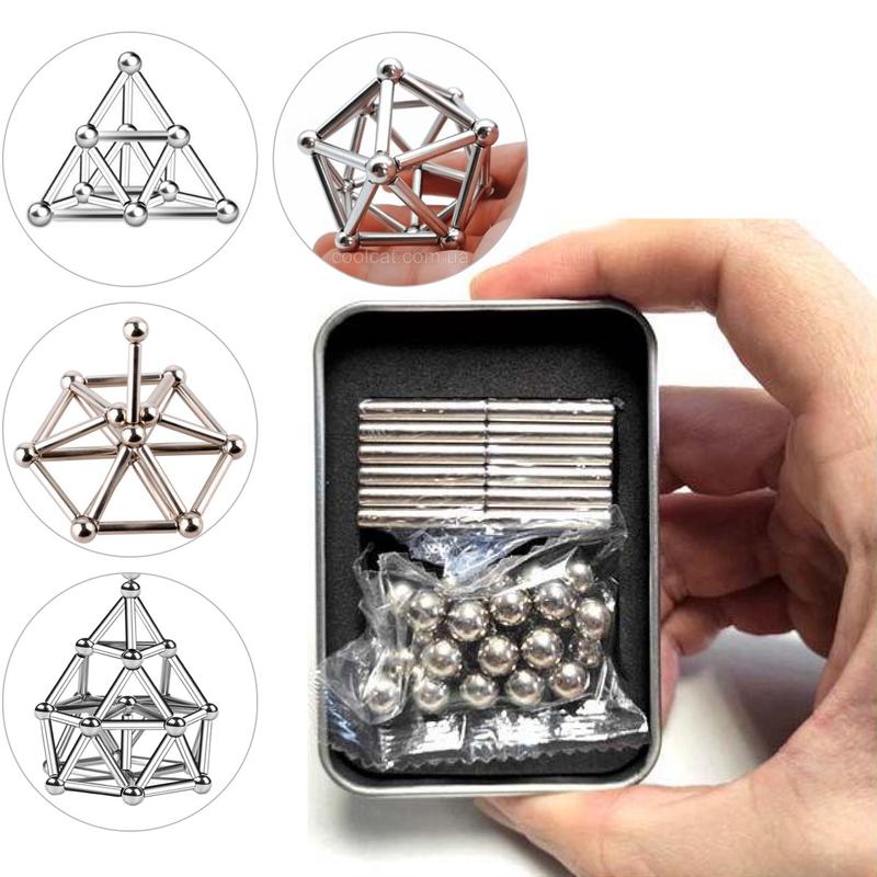 Детский магнитный конструктор Neo развивает пространственное и творческое мышление, память, креативность, а также отлично подходит для снятия эмоционального напряжения Преимущества: - Эффективное снятие стресса; - Развитие фантазии; - Развитие мелкой моторики рук, внимательности и аккуратности; - Увлекательное времяпрепровождение; - Можно собирать разные фигуры; - Качество и долговечность. Описание: Магнитный конструктор -- это антистресс для взрослых или игрушка для детей школьного возраста. Складывая необычные фигуры, Вы непременно отвлечетесь, отпустите посторонние мысли и интересно проведёте время.Также конструктор магнитный Neo - это отличный способ развивать мелкую моторику рук как детям (играть только под присмотром родителей, поскольку детали маленького размера). Магнитный конструктор Neo с цилиндрами хоть и обладает меньшим количеством элементов, чем классический, но зато их целых 2 типа: здесь есть не только привычные магнитные шарики, но и палочки (цилиндры), комбинируя которые можно создавать причудливые фигуры. Характеристики: - Тип: магнитный конструктор; - Материал: металл; - Комплектация: 36 палочек, 27 шариков; - Размер палочек: 12х3мм - Размер шариков: 8 мм; - Упаковка: металлическая коробка; - Размер коробки: 88x60x18 мм; - Цвет: серебристый. Комплектация: - Детский магнитный конструктор Neo; - 36 магнитных палочек; - 26 металлических шариков; - Упаковка.