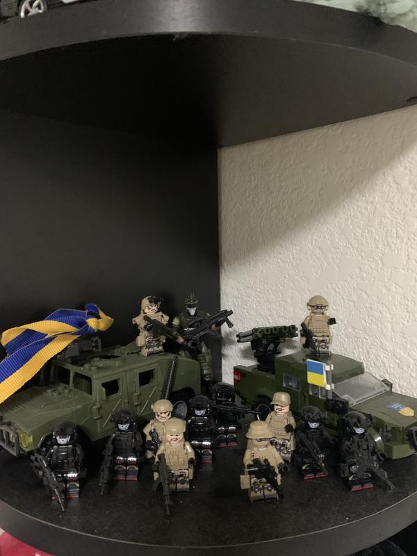 Набір з двох машинок, Хамві та Пікап з РСЗО, та 12 лего чоловічків з зброєю, +фігурка на фоні. Фірмової коробки нажаль немає бо це з різних наборів