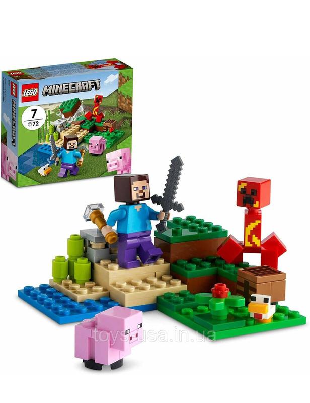 Лего Майнкрафт 21177 Lego Minecraft Засада Кріпера The Creeper Ambush Приєднуйтесь до Стіва для вибухової пригоди Minecraft® на рівнині. Займіться роботою за верстатом із блоками залізн яку. Подивіться у підзорну трубу — чи нема небезпек? Що ви бачите? Порося, курча... і крипера, що вибухає! Візьміть меч, щоб Стів міг захиститися. У вас мало часу: крипер, що вибухає, вже почервонів! Натисніть на перемикач, і бум! — вибух підкине його у повітря. Вік: 7+ Деталі: 72 Мініфігурки: 2 Коробка: 141х122х46