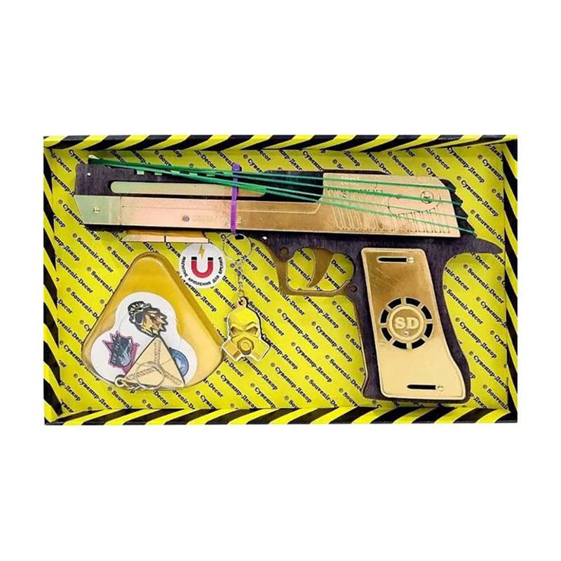 Деревянный пистолет в собранном виде. Все детали продуманы и выполнены из экологических материалов. Игрушка стреляет резинками для денег (резинки есть в комплекте), так же в наборе есть 2 брелока и наклейки. Размер оружия 25х13х2 см.