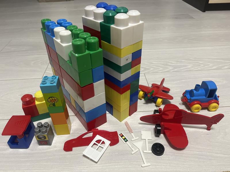 Великі блоки лего, а також в подарунок транспорт. Від 80-100 деталей. У відмінному стані. Яскраві, міцні.