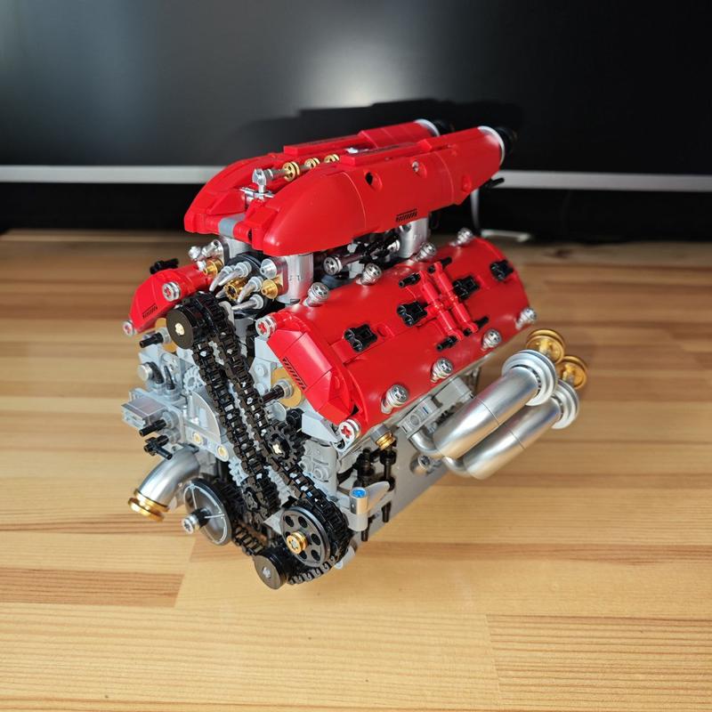 Собранный Двигатель Ferrari V8 Lego MOC с блоком питания. Функциональные поршни, видимая работа цепи ГРМ и имитация переключения передач для интерактивной игры. Двойные верхние распределительные валы с изменяемым временем открытия клапанов (VVT) и 4 клапана на цилиндр, точно воссозданные. Металлизированные детали повторяют блестящие детали настоящего двигателя. Размеры изделия: 22,3x16x23 см