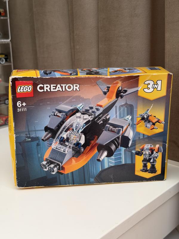 конструктор LEGO Creator 3-в-1 «Кібердрон» (арт. 31111). Цей набір дозволяє дітям від 6 років зібрати одну з трьох можливих моделей: власне кібердрон, кіберробота або кіберскутер. Основні характеристики набору Серія: LEGO Creator. Кількість деталей: 113 штук. Особливості моделей: Кібердрон: має два поворотні регульовані гвинти, рухомі закрилки на хвості та кабіну, що відкривається. Мініфігурка: у комплект входить фігурка робота з прозорою синьою головою, яка була новинкою січня 2021 року.