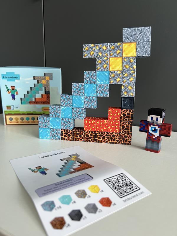 Набір «АЛМАЗНИЙ МЕЧ» - у наборі 42 блоки + 1 Герой 🧲Магнітний конструктор Minecraft – це ігровий набір, який дозволяє створювати різні 3D-моделі із блоків у Minecraft-стилі. У наборі представлені різні елементи, включаючи блоки, персонажів та предмети, що дозволяє відтворювати сцени з гри або створювати власні світи. Блоки виготовлені із екологічного дерева, з вбудованими магнітами які легко з'єднуються один з одним, і звісно яскраві принти неодмінно викличуть захоплення у дітей. Країна-виробник: Україна.