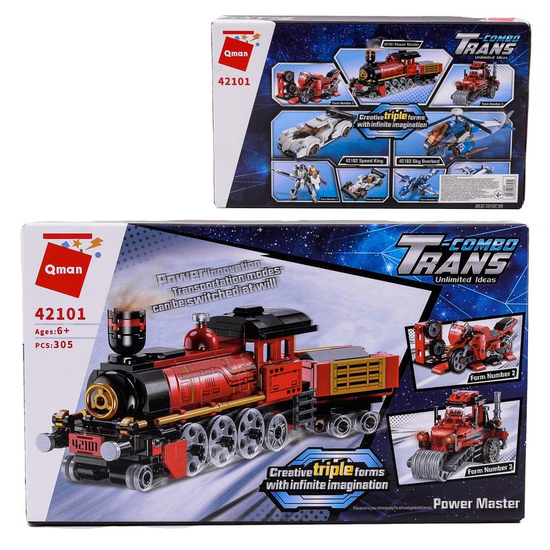 Конструктор Qman Потяг. 3 моделі транспорта в одному наборі, 305 деталей. Матеріал - пластик. Упаковка - коробка. Розмір упаковки - 32х5,5х19 см. Вік - від 6 років.