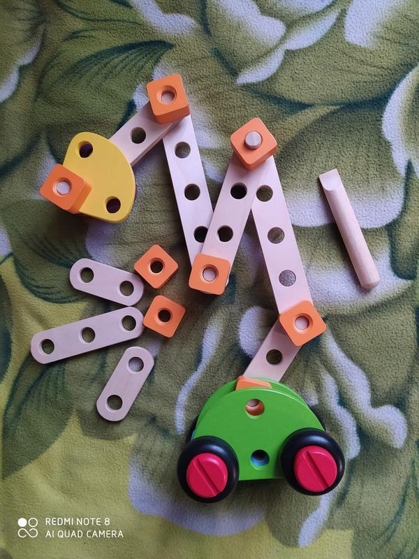 стан відмінний екологічно правильна, безпечна іграшка для дитини в комплекті викрутка, 17 досточек, 8 гайок, 10 болтів всі деталі великі, не мають гострих кутів і сколів, іграшка абсолютно безпечна для малюка