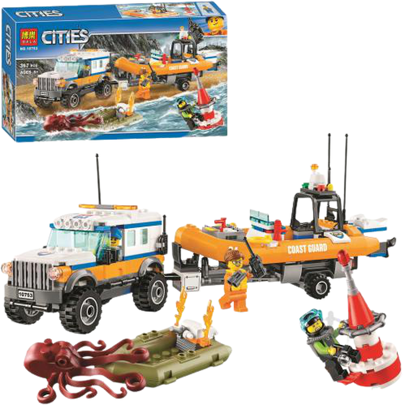 Любитель морской фауны решил понырять с аквалангом, чтобы сделать фотографии подводных обитателей. Арендовав моторную лодку, он уплыл как можно дальше от берега в надежде встретить какое-нибудь редкое животное. Но внезапно всё пошло не по плану! Мотор старой лодки не выдержал нагрузки и загорелся. Судно стало быстро набирать воду и тонуть. Дайверу пришлось спасаться, добираясь вплавь до буйка. Но и здесь его подстерегала опасность. Горящая лодка и её незадачливый хозяин привлекли внимание гигантского осьминога, дремавшего на дне. Он расправил свои щупальца и вот-вот дотянется ими до ныряльщика. Хорошо, что береговая охрана оказалась тут как тут. Они прогнали морского хищника, потушили пожар на лодке и помогли дайверу добраться до берега. Из деталей набора Bela 10753 Вы сможете собрать модель грузовика 4х4. Его корпус выполнен в бело-сером цвете с добавлением оранжевых и синих элементов. Спереди располагается кабина водителя, оборудованная закруглённым лобовым стеклом, боковыми зеркалами и открывающимися дверцами. Сняв часть крыши, можно заглянуть внутрь и рассмотреть место водителя и рулевое управление. Перед кабиной виден массивный капот с огромной радиаторной решёткой, круглыми фарами и усиленным бампером.