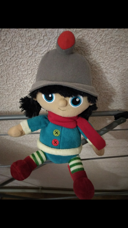 Нова, без бирки, сток. Мила м'яка музична іграшка, персонаж мультфільму "Пожежники". При натисканні на ліву долоньку видає звуки і горить ліхтарик на шапочці. Всередині на спинці пристрій для батарейок. Висота 25 см,ширина 17. Германия.