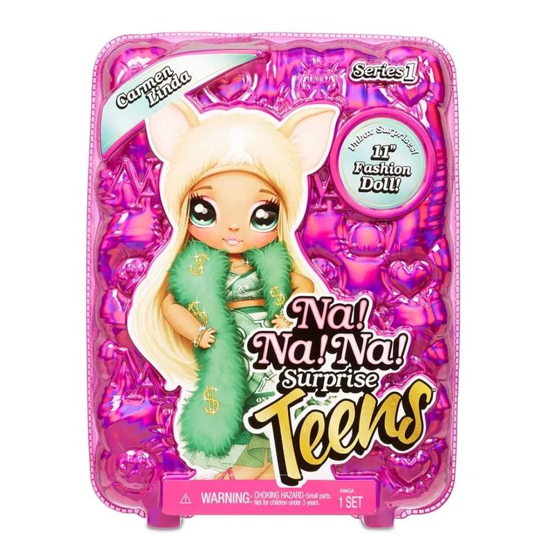 Ігровий набір Na! Na! Na! Surprise серії "Teens" - Кармен Лінда Зустрічайте нову серію ігрових наборів Na! Na! Na! Surprise! "Teens". Ці ляльки для дівчаток належать до fashion dolls. Вони стали вищими і рухливішими! З кожною лялькою у наборі йдуть модні аксесуари. Ще одна особливість, яка зробить гру з цими ляльками ще цікавішими – знімні головні убори. Тепер їх можна приміряти й іншим Teens! Наряд Кармен Лінди виглядає приголомшливо! Зелена сукня та хутряний шарф у грошових одиницях підкреслюють її статус. Ця світловолоса лялька для дівчаток чимось схожа на маленьких чихуахуа – вона дуже мила, а її вбрання, незважаючи на свій блиск , говорить про грайливий і непосидючий характер. Кармен Лінда стане окрасою для будь-якої колекції! Особливості: висота ляльки – 28 см; велика рухливість; у ляльки розкішне довге волосся, яке можна розчісувати; у комплекті до кожної ляльки йдуть аксесуари: туфлі, модне вбрання, знімний плюшевий головний убір та щітка. У наборі: лялька 28 см; аксесуари.