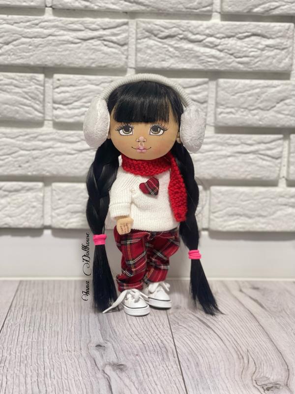 Авторська лялька.Зріст малечі 28 сантиметрів.Одяг та взуття знімаються.Може самостійно стояти та сидіти.Голова повертається,ручки гнуться.Подарункове пакування.