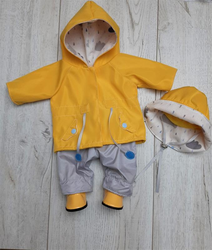 Набір одягу для пупса 43см складається з: -дощовичка -штанців -капелюшка -реглана з аплікацією. Чобітки можна замовити окремо.