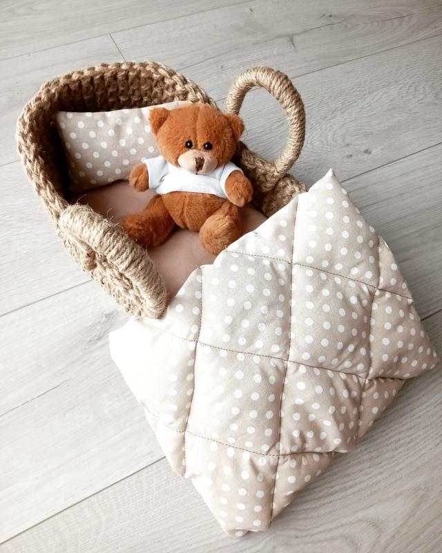 Пропоную вашій увазі джутову дитячу люльку для пупсів. Розміри 26х15см, висота 10см. Люлька іде з наповненням матрас-подушка + ковдра.