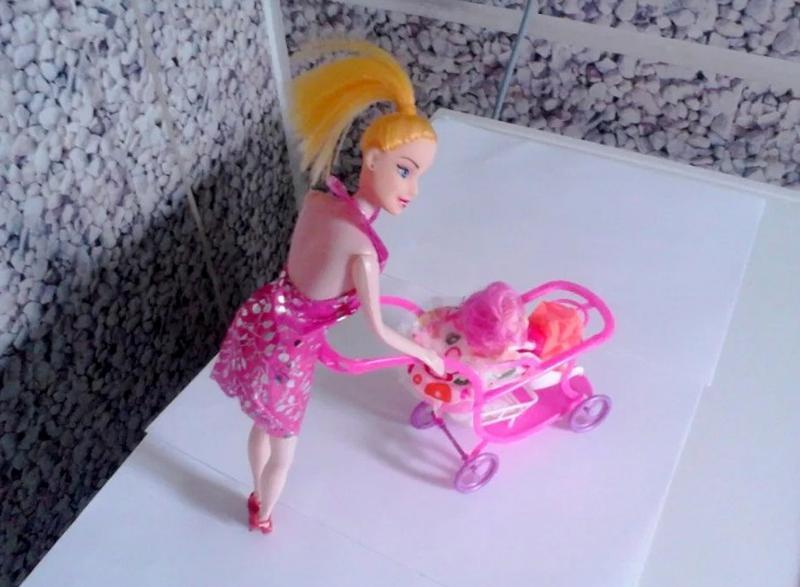 Лялька з пупсом одягнені, взуті. Одяг і взуття знімаються. Коляска - колеса крутяться - відкидний сонцезахист - відцепний ящик для речей. Лялька, пупсик, коляска виготовлені з пластмаси. Висота ляльки - 27 см, пупса - 10 см, коляски - 17 см (при довжині 15 см. ). Упаковка - кульок. Надсилання посилок щодня.