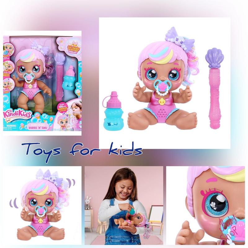 Кукла пупс Kindi Kid, Poppi Pearl Когда она будет готова пускать пузыри вместе с вами, она будет вдохновлять и петь свою веселую песню! Накормите Поппи Жемчуг из ее бутылочки, затем нажмите на муску на ее купальнике на одну секунду. Поппи скажет: "Время пузырей!" и начните петь ее песню и выдувать восхитительные пузырьки с ароматом мороженого из ее рта! Она такая милая! Особенности и детали Я выдуваю сотню пузырей с запахом мороженого! Я хихикаю и поют свою веселую песню! Накорми меня из моей бутылочки для кормления, чтобы я мог пускать пузыри! Наденьте пузырьки вместе со мной, используя свою собственную палочку с пузырями.
