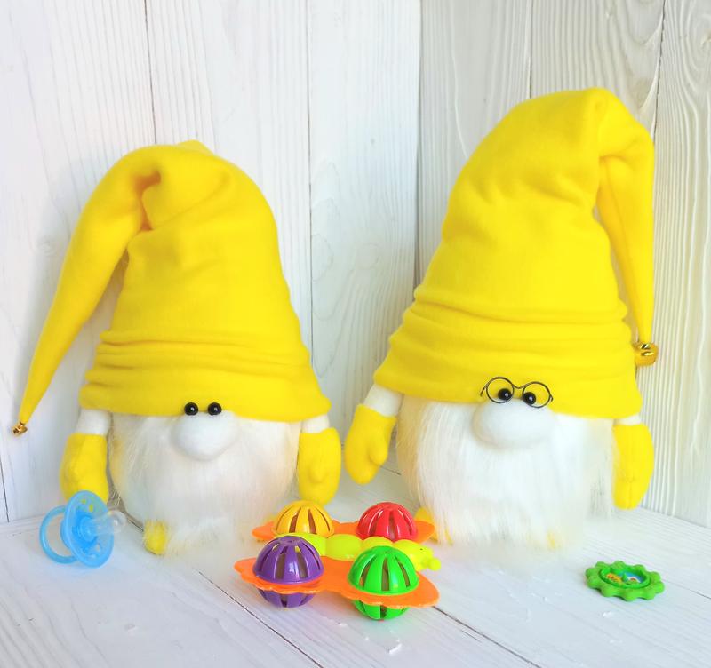 Чарівна парочка гномиків-братиків яскравого жовтого кольору. Чудовий незабутній подарунок, оригінальний презент для діточок: на День народження, хрестини, виписку з пологового, запис в дитячий садочок. Можливе виготовлення одного гномика. Ціна вказана за пару.