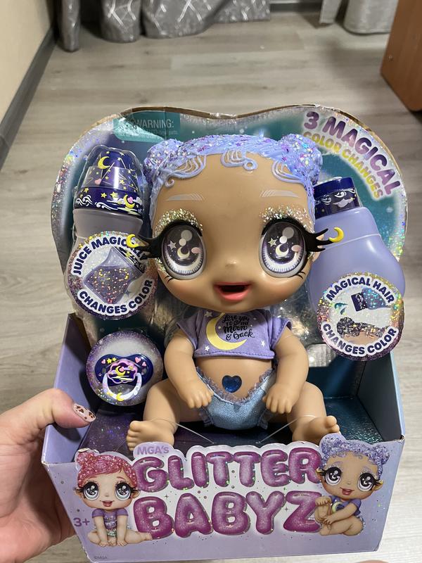 Куколка, украшенная блестками, с волосами, которые меняют цвет Футболочка с милым принтом Бутылочка для сока, которая меняет цвет Бутылочка для шампуня, которая меняет цвет Пустушка Подгузник Высота куклы в положении сидя 20 см.