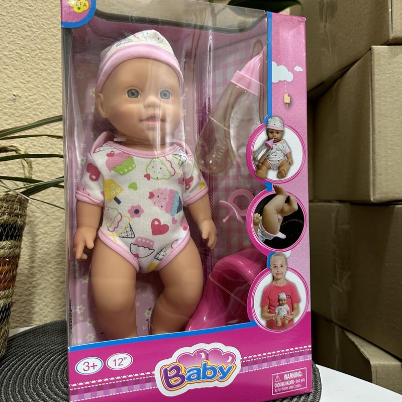 Пупс в боди и шапочке, с горшком, бутилочкой и пустышкой. Материал: пластмасса и ткань.