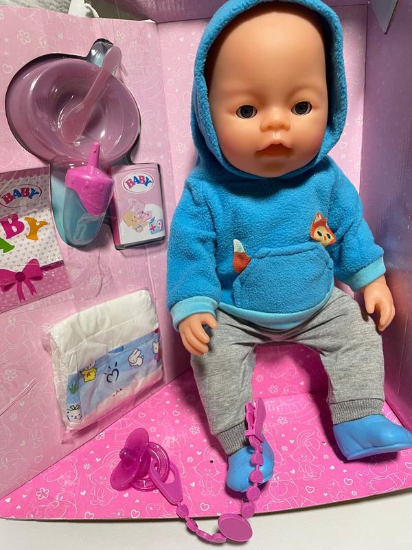 Функции: пьет из бутылочки, закрывает глазки, писает в горшок, ходит "по большим делам", пищит, кушает кашу, текут слезки, двигает руками и ногами, купается, закрывает глаза от магнитной соски. 12 аксессуаров: одежда, бутылочка, мисочка, ложечка, соска, горшочек, памперс, питание для куклы, свидетельство о рождении, кулончик, магнитная соска. Высота пупсика: 42 см. Размер коробки: 33х19х38 см. Возрастная группа: 3+