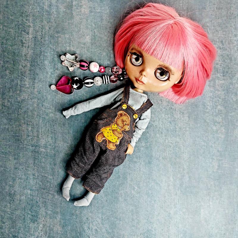 Комбинезон для куклы Блайз из микро вельвета с аппликацией мишки. Комбинезон полностью на подкладе из батиста контрастного желтого цвета. Застегивается на кнопки. Есть карманы. В комплекте к комбинезону лонгслив и высокие носки серо-голубого цвета из тонкого хлопкового трикотажа.