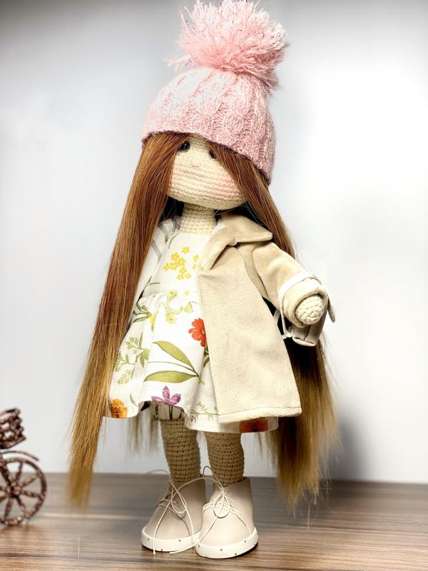 Лялька звʼязана гачком з 100% бавовни. Одягнена в сукню, пальто , шапка з балабоном , чобітки на ніжках і аксесуар рюкзачок ) Ручки і ніжки згинаються,вміє стояти , голова теж рухлива одяг знімається.🤗. Ця красуня підійде для діток і дорослих і можна використовувати як інтерʼєрну прикрасу - Має зріст ляльки 32-33 см - Волосся довге штучне ( можна розчісувати і робити зачіски - Одяг, шапка,взуття знімаються - Голова ляльки повертається . - Є в наявності та можна під замовлення 😃