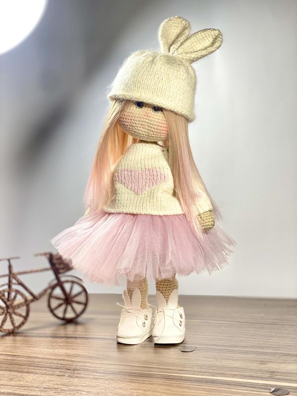 Кукла связана крючком из 100% хлопка. Одетая в фатиновую юбку, шапка -зайчик,, сапожки с ушками ) Ручки и ножки сгибаются, умеет стоять, голова тоже подвижная одежда снимается.🤗. Эта красавица подойдет для деток и взрослых и может использоваться как интерьерное украшение - Имеет рост куклы 29-30 см(без одежды) - Волосы длинные искусственное ( можно расчесывать и делать прически - Одежда, шапка, обувь снимаются - Голова куклы поворачивается. - Есть в наличии и можно под заказ 😃