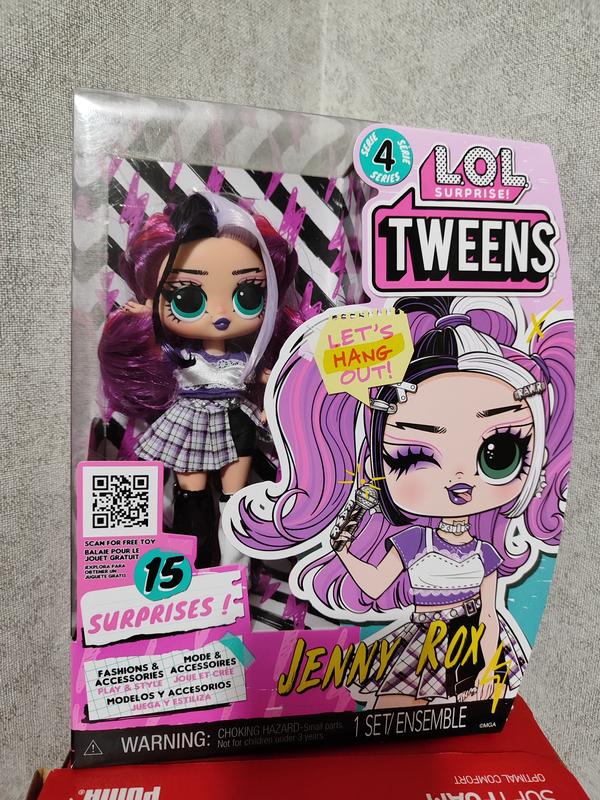 Ігровий набір із лялькою L.O.L. SURPRISE! Tweens – Jenny Rox / Дженні Рокс — модна лялечка з триколірним волоссям, картатою спідницею з 15 сюрпризами! До ігрового набору входить: Лялька з нової серії Tweens, зростом 15 см; 15 сюрпризів — одяг, взуття та стильні аксесуари. Підставка для ляльки входить до комплекту