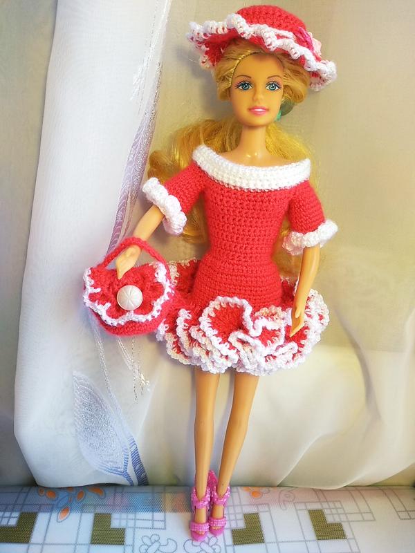 Комплект одягу для ляльки Барбі ( сукня, шляпка, сумочка) якісна робота. Комплект коштує 150 грн. Якісна робота. Сукню легко одягати, на спинці застібка. Перешлю.