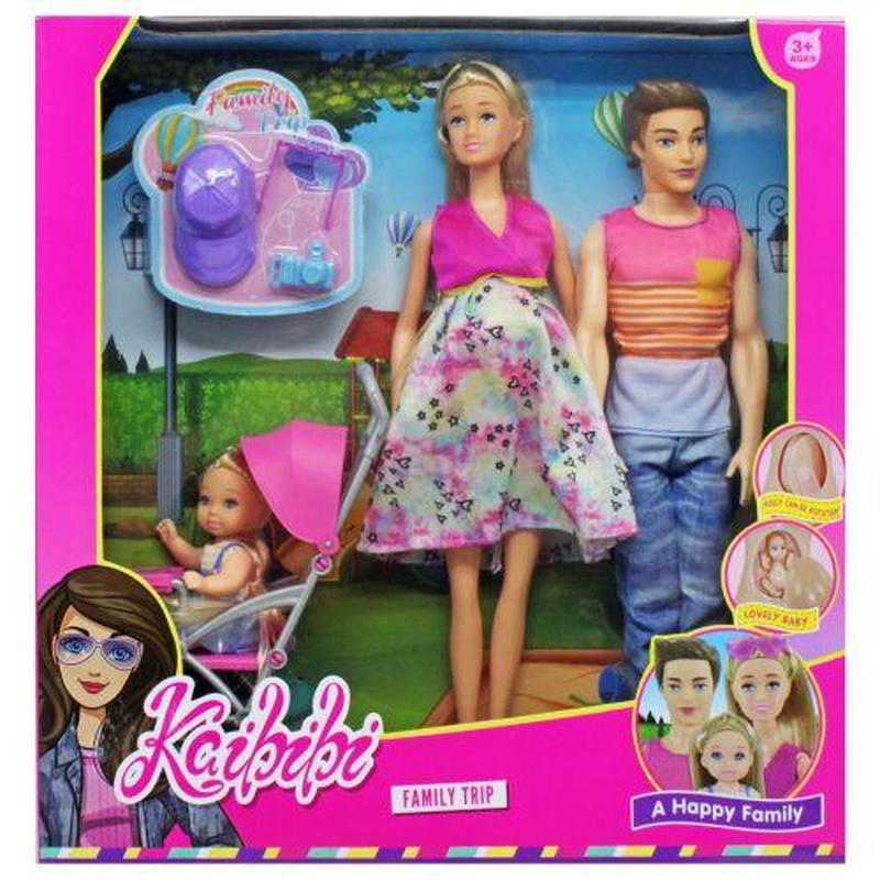 Яркий кукольный набор, в который входит три куклы: беременная кукла-мама, папа и ребенок. Живот беременной куклы можно открыть и посмотреть на ребеночка внутри. В комплекте есть коляска для ребенка и аксессуары для взрослых - кепка, очки и фотоаппарат. Высота взрослых кукол: 28 см. Имеют подвижные руки, ноги и головы.