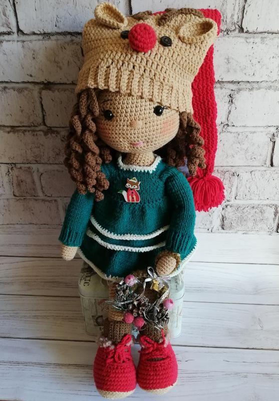 Продана. Зимняя, новогодняя кукла. Платье а-ля ищумрудная елка, на оборках будто снег лежит, шапка с оленевой мордочкой, в руке новогодний венок. У куклы очень красивые локоны. Рост куклы 45 см. Вся одежда и обувь снимается. Выполнена из полухлопковой пряжи YarnArt jeans. Товар изготавливается по заказу 10 дней.