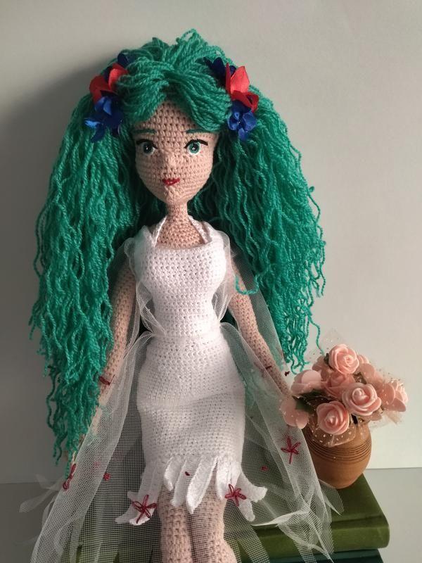 Героїня українського 3D анімаційного фільму за мотивами драми-феєрії Лесі Українки Мавка Лялечка ручної роботи.Зв'язана з напівбавовняної пряжі.Наповнювач гіпоалергений холофайбер. Має каркас.Ніжки ручки сгинаються. Одяг знімається. Очі ротик носик вишиті ручною вишивкою.Заколочки на волоссі знімаються. На сукні ручна вишивка. Є спідня білизна,яка знімається Висота лялечки 50 см Товар виготовляється на замовлення
