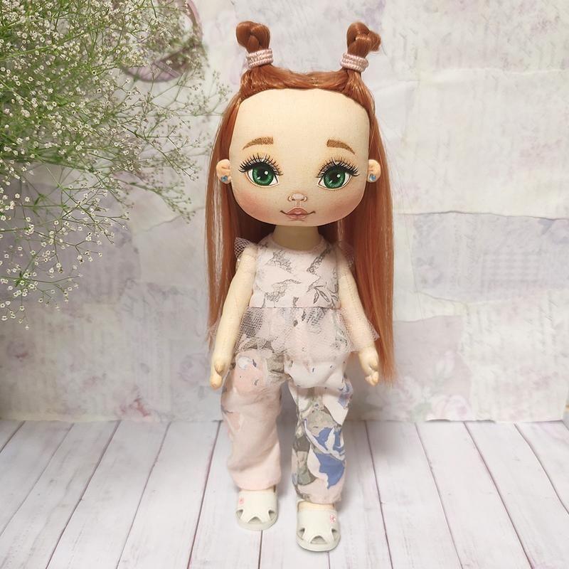- зріст 26 см; - виготовлена з бавовни; - наповнювач - синтепух; - личко розписано спеціальними акриловими фарбами і надійно закріплено; - ручки і ніжки на гудзиковому кріпленні; - стоїть і сидить самостійно; - голівка повертається; - волосся з штучних тресс надійно пришите; - лялечка підійде для гри акуратним дівчаткам. ------------------- Ця лялечка стане відмінним подарунком Вам і Вашим близьким, додавши крапельку теплоти і світла в Ваш дім. ------------------- Текстильна лялька ручної роботи - не просто іграшка або предмет інтер'єру, але ще й шматочок душі і тепла майстра, адже в цю копітку роботу вкладено безмірну кількість любові. Цим вироби ручної роботи і відрізняються від конвеєрного виробництва - душею і індивідуальністю. Можна купувати їх собі, колекціонувати або дарувати, радуючи друзів і близьких, в будь-якому випадку лялечка буде дарувати посмішки та приємні емоції.