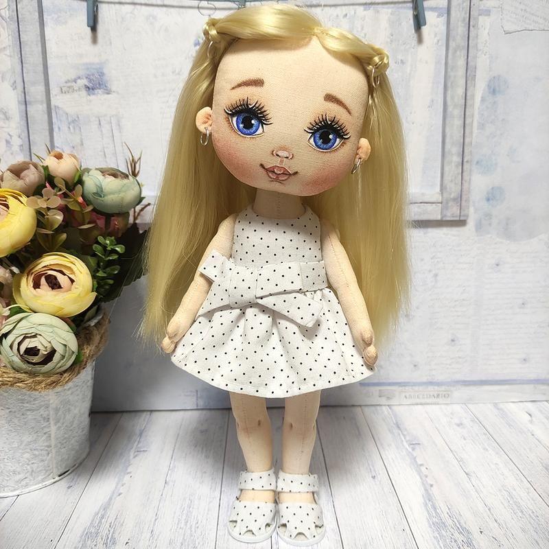 - зріст 26 см; - виготовлена з бавовни; - наповнювач - синтепух; - личко розписано спеціальними акриловими фарбами і надійно закріплено; - ручки і ніжки на гудзиковому кріпленні; - стоїть і сидить самостійно; - голівка повертається; - волосся з штучних тресс надійно пришите; - лялечка підійде для гри акуратним дівчаткам. ------------------- Ця лялечка стане відмінним подарунком Вам і Вашим близьким, додавши крапельку теплоти і світла в Ваш дім. ------------------- Текстильна лялька ручної роботи - не просто іграшка або предмет інтер'єру, але ще й шматочок душі і тепла майстра, адже в цю копітку роботу вкладено безмірну кількість любові. Цим вироби ручної роботи і відрізняються від конвеєрного виробництва - душею і індивідуальністю. Можна купувати їх собі, колекціонувати або дарувати, радуючи друзів і близьких, в будь-якому випадку лялечка буде дарувати посмішки та приємні емоції.
