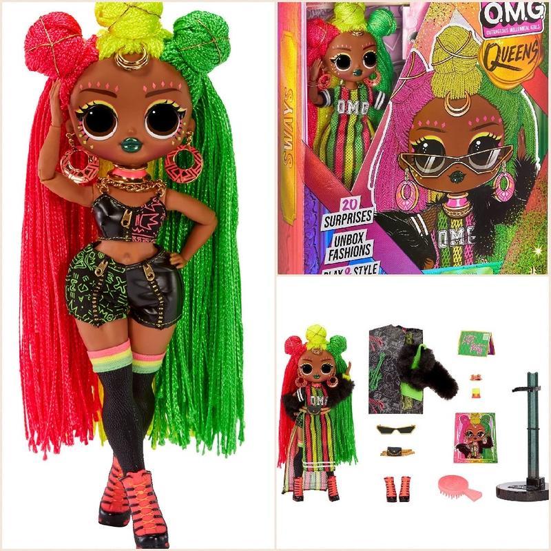 Кілька примірників у наявності Лялька LOL OMG Королева з аксесуарами 👑 Яскравий одяг, різнобарвне волосся, яскравий макіяж виділяють цю ляльку серед інших! (Краща) Довге триколірне волосся заплетене в маленькі африканські кіски. На макушці є три хвости. У наборі ви знайдете: велику та яскраву ляльку заввишки 28 см, 2 комплекти стильного одягу в спеціальних чохлах для зберігання, чорну шубу, гребінець, підставку для ляльок, жовтий браслет; прикраса для волосся; модну сумку на пояс; окуляри з вузькими лінзами та інші аксесуари. У ляльки відкидні підлокітники, що дає змогу придумувати ще цікавіші сценарії для гри та реалізовувати різні пози для фотосесій; паковання можна використовувати як гардеробну, а також для зберігання речей і аксесуарів 🛍️ Оригінальна версія MGA 👍