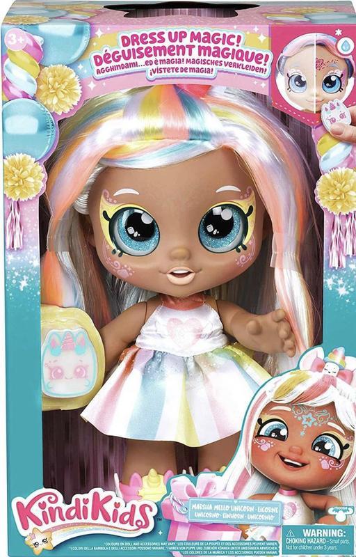 Кілька примірників у наявності Dress Up Magic Marsha Mello Unicorn любить грати в переодяганні та має чарівну фарбу для обличчя. Дівчаткам сподобається вечірка з цією милою колекційною лялькою, а до комплекту постачання ShopKindress Up Magic Marsha Mello Unicorn входить симпатична губка Shopkin, щоб дівчатка могли чарівним способом розкрити фарбу на обличчі. Просто використовуйте крижану воду, щоб побачити чудовий малюнок Марші. Чарівна лялька Marsha Mello Unicorn Dress Up одягнена в чарівне плаття з райдужним єдинорогом, має відповідну пов'язку на голову із зображенням єдинорога та туфлі з ріжками. Її одяг і взуття взаємозамінні, що робить гру ще цікавішою У Марші Мелло великі блискучі очі. Вона оживає веселими рухами, поки діти беруть її та грають Дітям віком від трьох років сподобається заряджатися та веселитися з усіма ляльками Kindi Kids. Зберіть усіх ляльок із серії Dress Up Magic, а також усіх їхніх сестер Kindi Kid. Rainbow Kindi ще ніколи не була такою веселою.