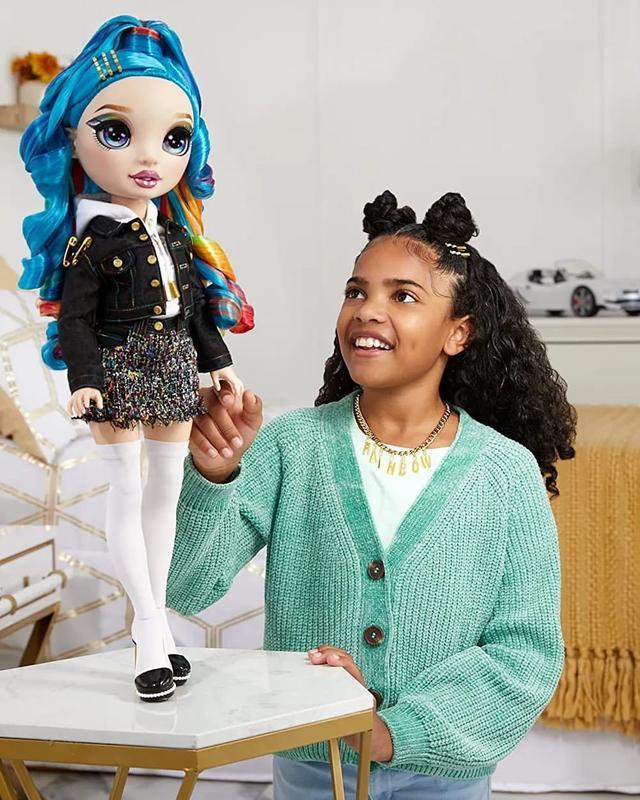 Кілька примірників у наявності Мегакукла колекційна Rainbow High Амайя Мегакукла колекційна Rainbow High Амайя — найбільша лялечка в сім'ї Rainbow High! У комплекті 2 набори одягу та взуття, аксесуари як для ляльки, так і для дівчинки: браслети та кільце. Ремінь із літерами для ляльки може бути стильним чокером для дівчинки. ОСОБЛИВОСТІ МЕГАКУКЛИ КОЛЕКЦІОННОЇ RAINBOW HIGH АМАЯ: матеріали: полімерні, гума, текстиль; висота ляльки з повною артикуляцією: 60 см; довжина райдужного волосся: 35 см; в наборі: 1 лялька, одяг, взуття та аксесуари для ляльки, аксесуари для дівчинки. Виробник: Rainbow High