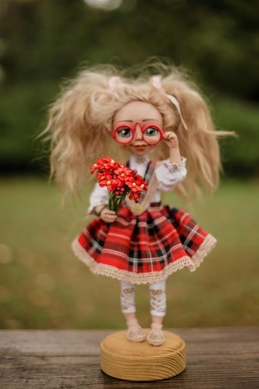 Школьница - авторская кукла ручной работы. Роспись масляными и акриловыми красками,тело - синтепон на проволочном каркасе, это позволяет придать кукле любое удобное положение и менять позицию ручек, стоит на деревянной подставке,,можно менять причёски (аккуратно)..Вес 302 г с подставкой,рост 30см кружево, хлопок,волосы - мех ламы, в комплекте две пары очков)) и букетик. Единственный экземпляр. Изготовлена в г. Житомир.