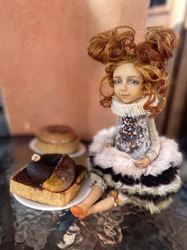 Десерт - авторская кукла ручной работы. Голова, руки и ноги выполнены и запекаемого пластика Living doll,роспись масляными и акриловыми красками, закреплена лаком Mr. Super Clear, тело - синтепон на проволочном каркасе, сидит самостоятельно,бисер, кружево, велюр, шифон,хлопок, трикотаж, волосы - мех ангоры, Изготовлена в г. Житомир.